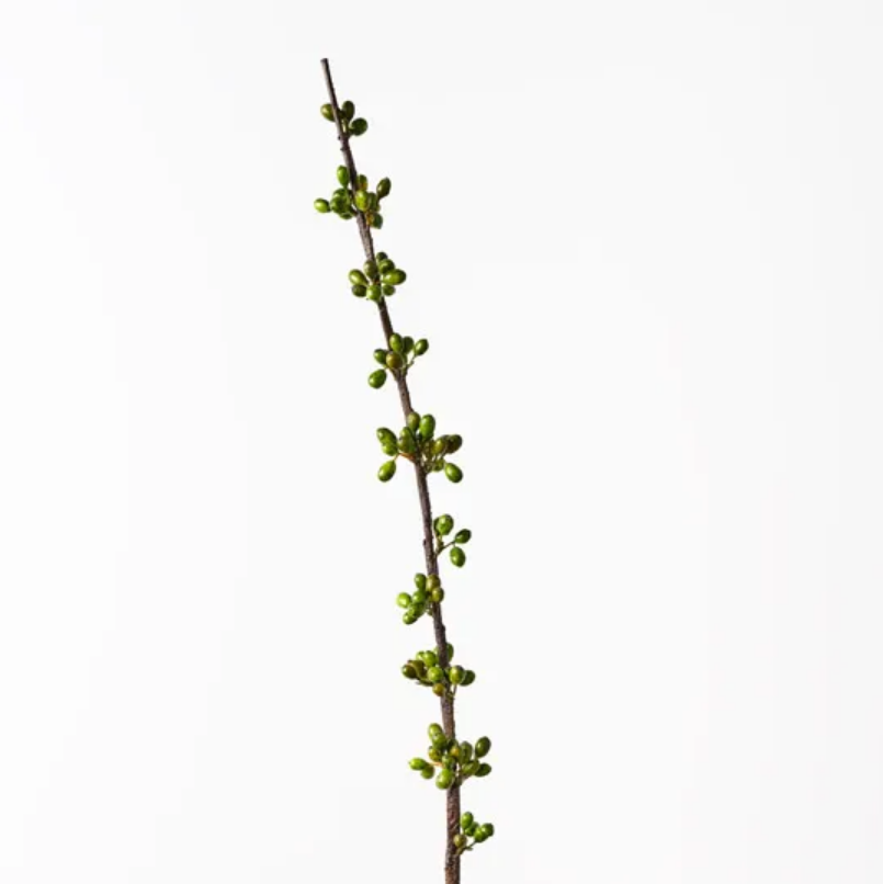 Introducing the Green Coffee Bean Spray, showcasing vibrant green hues reminiscent of fresh coffee beans. This botanical stem adds a natural and refreshing touch to floral arrangements or decorative displays, perfect for enhancing your home decor with its lively and verdant appearance. Ideal for those seeking to bring a bit of nature's beauty indoors.