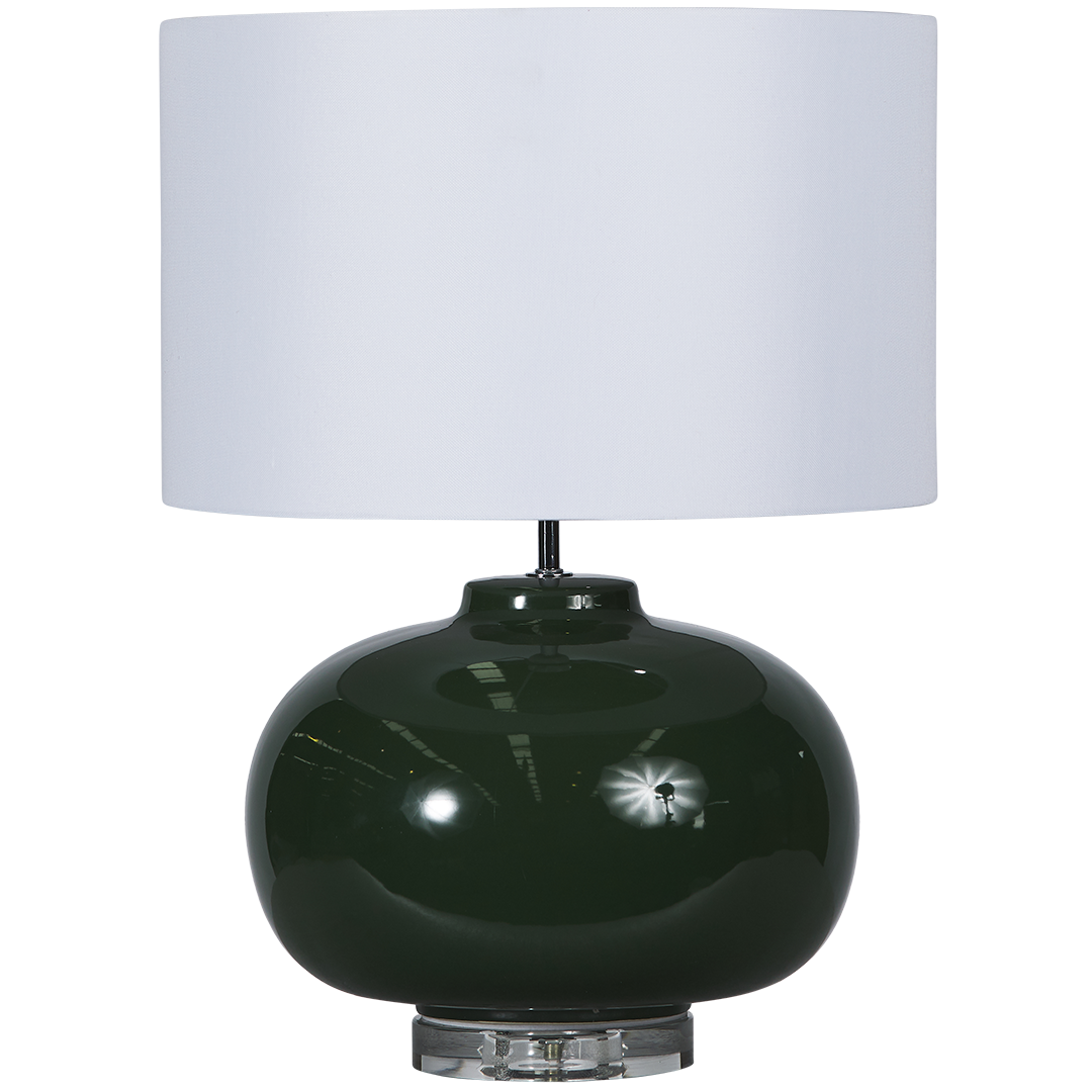The Forage Lamp boasts a teapot-shaped ceramic base in Brunswick green, sitting on an acrylic base and finished with a white shade.