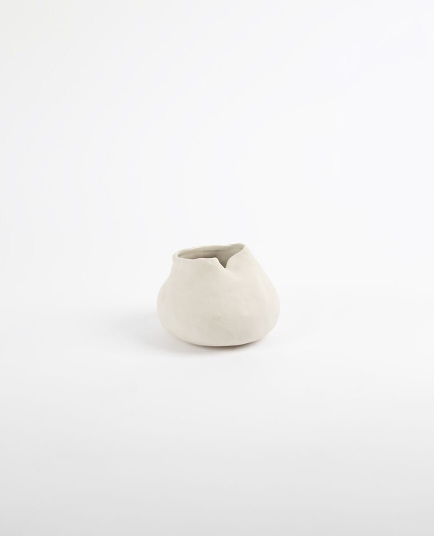 The Gaia vase has a matte finish with a glossed glaze inside. Its unbalanced shape makes for unique curves from all angles. Can be used to display flowers or on its own.