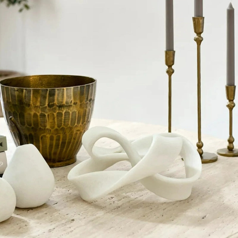 The infinity sculpture is a d cor piece that will bring shape and form into your interior, an ideal object for coffee tables or side boards. It is cast from quartz sand resin, and has a marble-like appearance. It's ribbon-esque form symbolises infinite or unending time. Care Instructions: Wipe with a soft dry cloth Dimensions: 28cm W by 34cm D by 17.5cm H