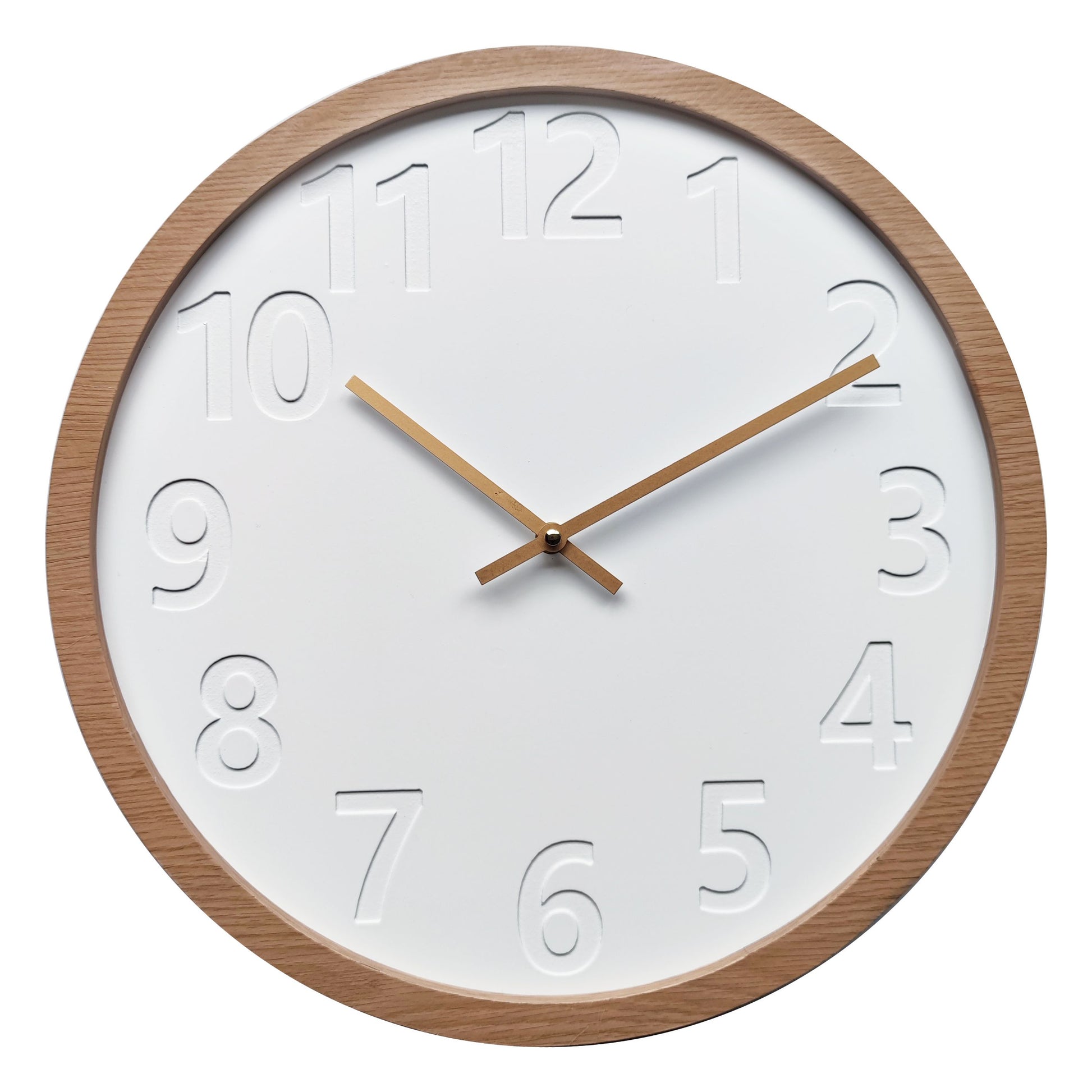 John wall clock features a natural timber-look frame for that timeless, organic look. A white face contrasts with the hands and frame. Clock runs on one AA battery.