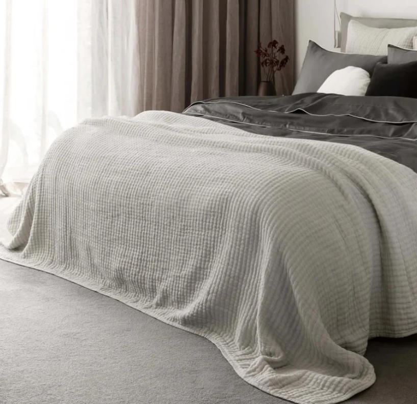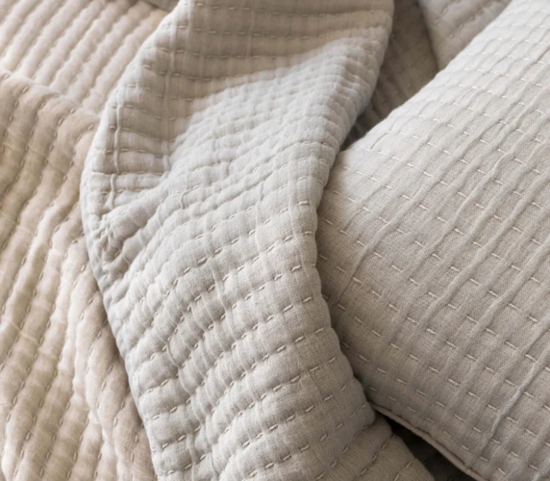 Gorgeous and plush, Maddox Silver Quilt features 100% cotton voile construction and is skilfully hand-embroidered with a Kantha stitch detail. Silver on one side and natural on the reverse, these quilts offer a luxurious tactile experience.