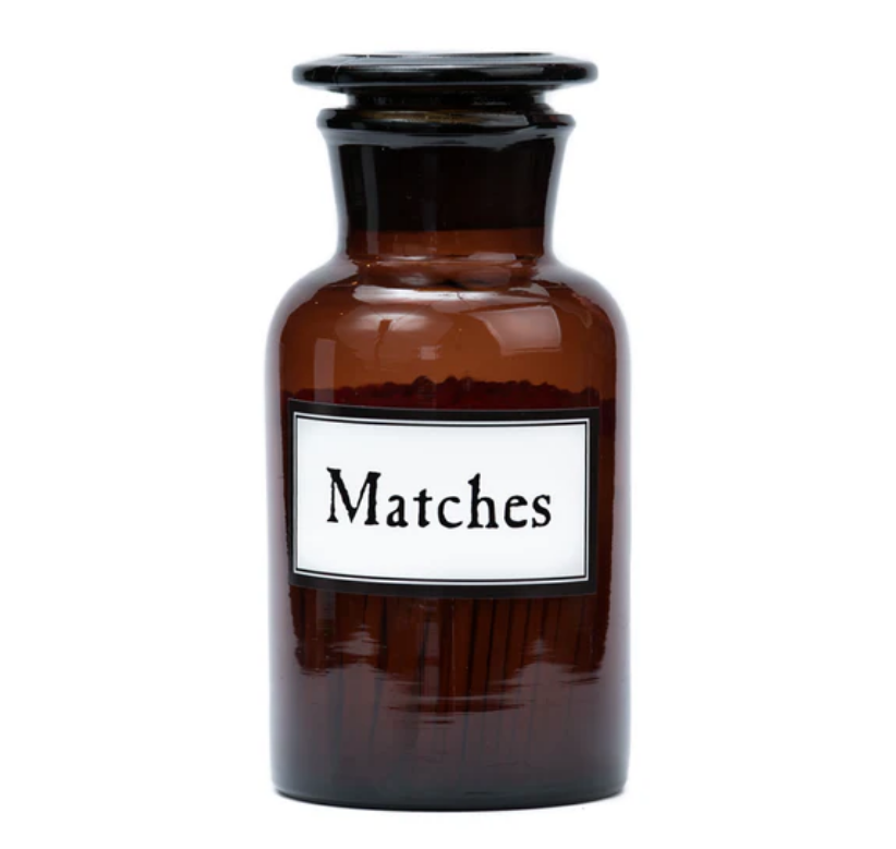 This popular and super practical bottle of extra-long matches, crafted in apothecary glassware that is hand blown making each piece original and unique. Fitted with striker paper that is located on the back of the jar.