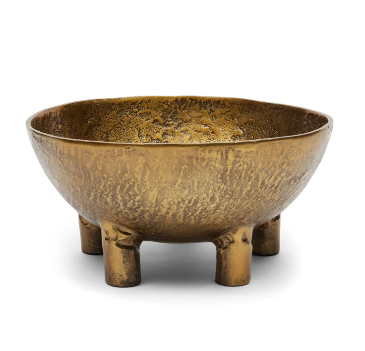 The Mondo Bowl Large. Formed from raw aluminium with an aged textural gold finish. Designed to be both eye-catching & functional. Crafted from quality materials, this large bowl rests sturdily on 4 legs & is useful as a serving or centrepiece bowl. Will add visual interest as a decorative item.