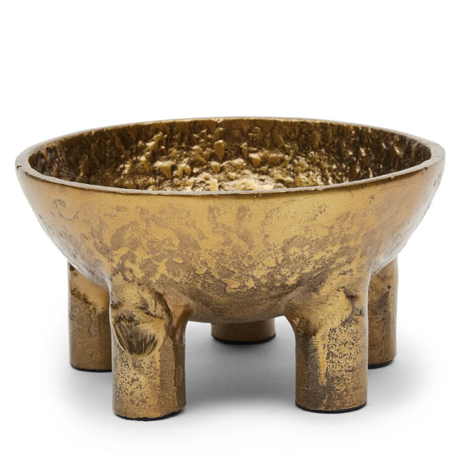 The Mondo Bowl Large. Formed from raw aluminium with an aged textural gold finish. Designed to be both eye-catching & functional. Crafted from quality materials, this large bowl rests sturdily on 4 legs & is useful as a serving or centrepiece bowl. Will add visual interest as a decorative item.