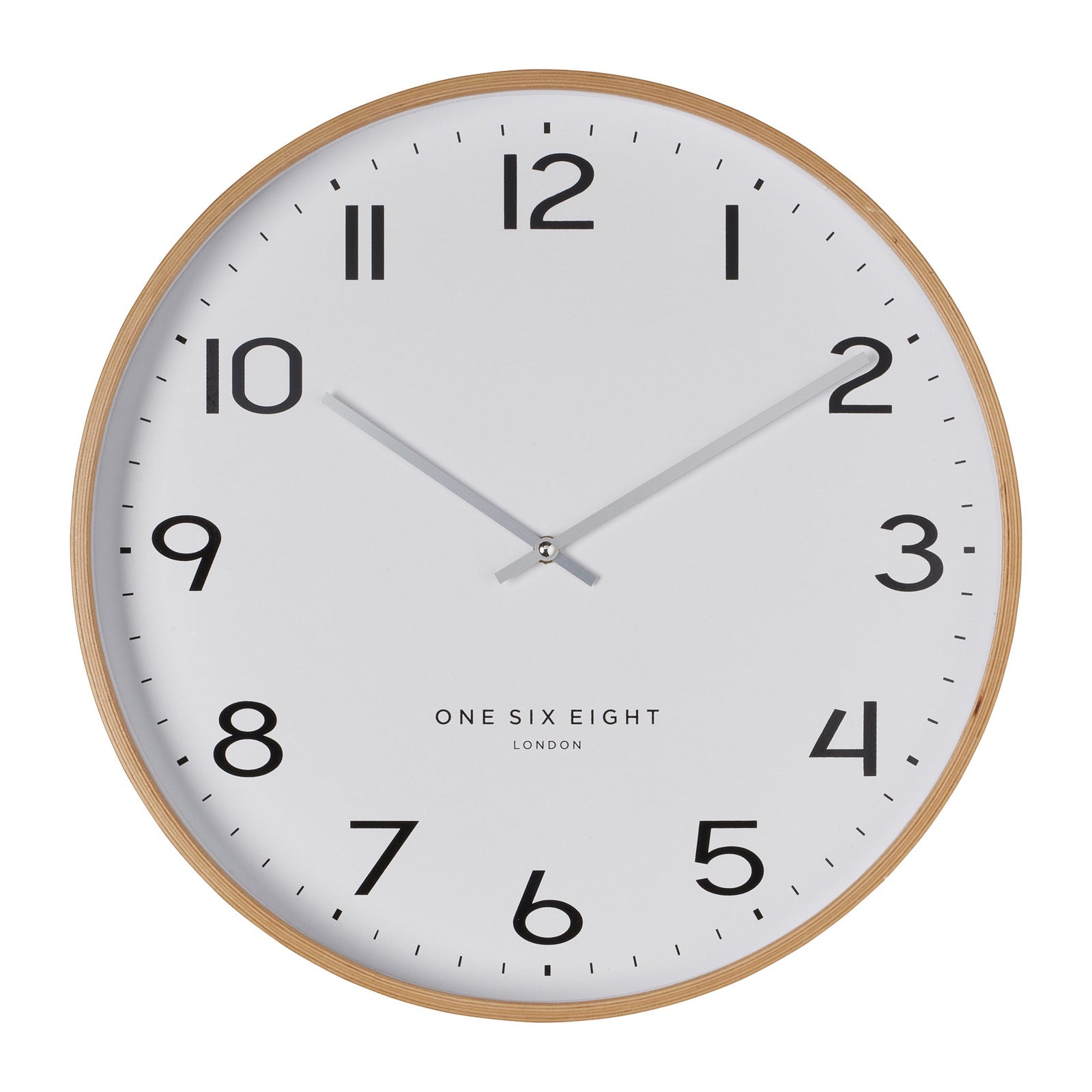 The SILENT Olivia Wall Clock by One Six Eight London features bold Arabic numerals, striking brushed chrome hands. The Olivia also has a lovely plywood case and a glass lens. The safe option that is sure to suit all homes and offices. Available a diameter of 41cm with a depth off 4.5cm.. Using the highest quality silent clock movement, the Olivia wall clock has been designed in the UK and comes complete with a stunning gift box. The Olivia also comes with an amazing 5 year manufactures warranty A conservative white dial with black Arabic numerals combines with the plain wooden casing and brushed brass hands of the Olivia Wall Clock in a fusion of traditional style and modern materials.
